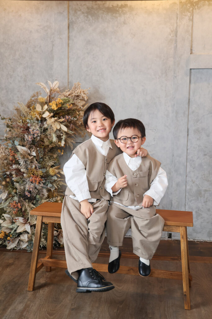 七五三の撮影だからと決まった服装はありません。カジュアルな洋服でも色味や素材感をあわせてコーディネートすると家族写真をオシャレに残すことができます。