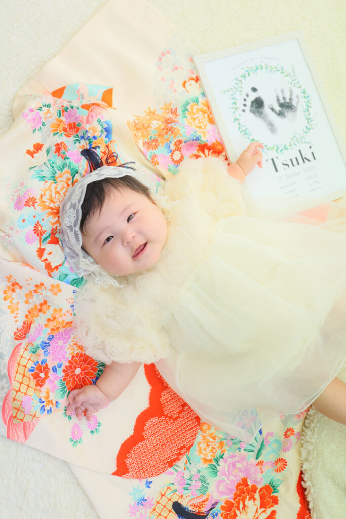 お宮参りの産着・ベビードレスのレンタルあり。ぬいぐるみ、エコー写真、命名書などのお持ち込み大歓迎。