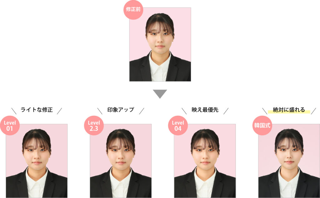 レタッチで盛れる流行りの韓国式証明写真仕上げや、