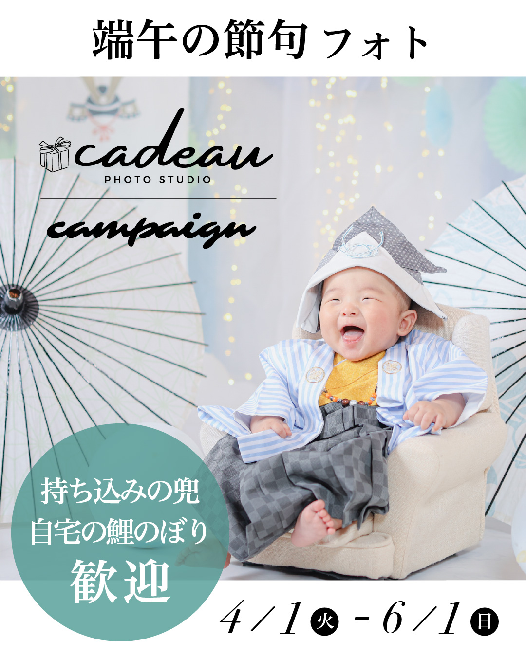 男の子の成長を願う端午の節句。店舗にある兜や和傘などアイテムは無料でお使いいただけます。ご自宅でおじいちゃん、おばあちゃん、親戚みんなで一緒に撮影したり、笑顔になったりする瞬間は、家族みんなの心に残ります。